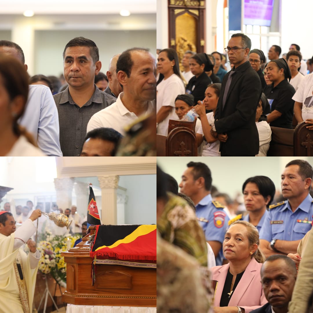 Dili, 19 Maiu 2025 â Estadu Timor-Leste hamutuk ho famÃlia no sarani katólika haloot ona Saudozu Pe. Domingos da Silva Soares âMAUBEREâ nia isin mate iha fatin deskansa ikus, semitériu Maloa, hafoin remata misa funebre iha Igreja Katedral Dili.