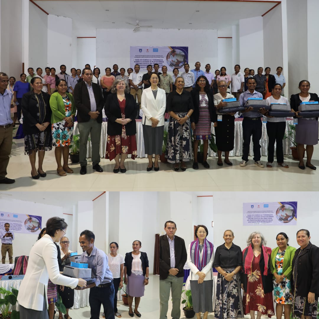 Sua ExelΓ©nsia Ministra Edukasaun Dra. Dulce de Jesus Soares ho Embaxadora Xina iha Timor-Leste Sra. Wang Wenli no reprezentante UNICEF Sra. Patrizia Di Giovanni, halo lansamentu formasaun daruak kona-ba asesu Plataforma online eskola ba uma no fahe ekipamentus eletrΓ³niku sira ba profesor sira husi eskola 21 iha munisΓpiu DΓli neβebΓ© afeta inundasaun iha tinan 2021, iha Salaun Ian Martin INFORDEPE.